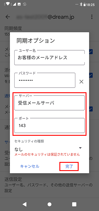 受信サーバの設定入力内容表 ログインが必要 オン ユーザー名 お客様のメールアドレス パスワード メールパスワード SMTPサーバ 送信メールサーバ ポート、セキュリティの種類を設定する画面が表示された場合