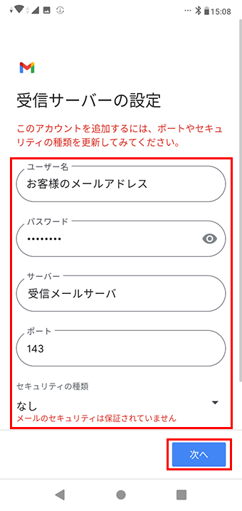 受信サーバの設定入力内容表 ユーザー名 お客様のメールアドレス パスワード メールパスワード SMTPサーバ 受信メールサーバ ポート 143 セキュリティの種類 なし