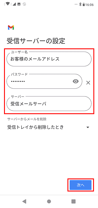 7 メールパスワードを入力し、「次へ」をクリックします。