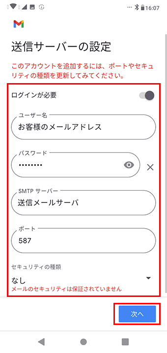 ポート、セキュリティの設定入力内容表 ポート 587 セキュリティの種類 なし セキュリティの種類を先に設定してください。