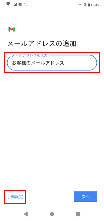 5 設定するメールアドレスを入力し、「手動設定」をクリックします。
