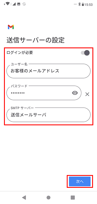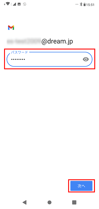 7 メールパスワードを入力し、「次へ」をクリックします。