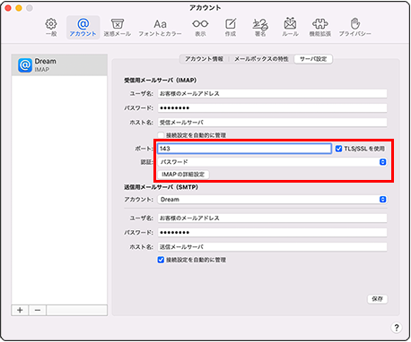 ポート 143 TLS/SSLを使用 チェックを外します 認証 パスワード -