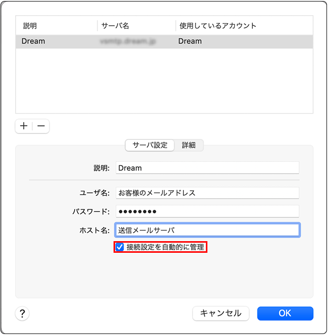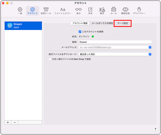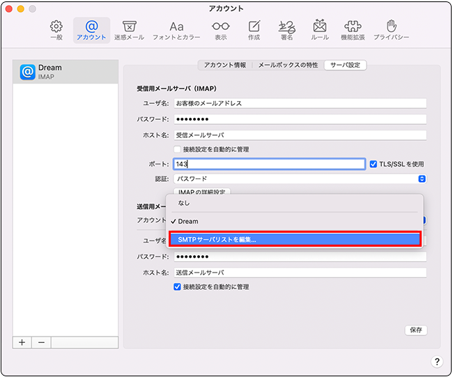 メールアドレス お客様のメールアドレス ユーザ名 お客様のメールアドレス パスワード お客様のメールパスワード アカウントの種類 IMAP 受信用メールサーバ 受信用メールサーバ 送信用メールサーバ 送信用メールサーバ DTIのメールサーバでは、SSL(暗号化)にも対応しております。