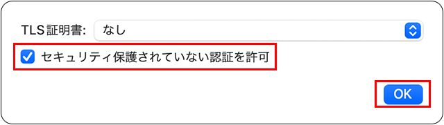 16 「セキュリティ保護されていない認証を許可」にチェックを入れ、「OK」をクリックします。