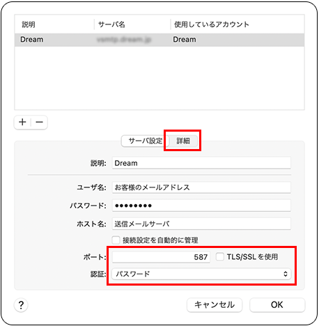 ポート 587 TLS/SSLを使用 チェックを外します 認証 パスワード -