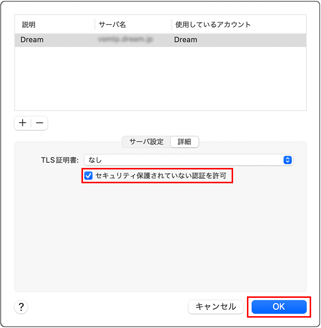 11 「セキュリティ保護されていない認証を許可」にチェックを入れ、「OK」をクリックします。