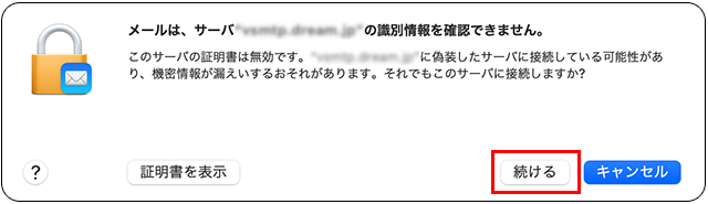 - 識別情報を確認できませんの画面が表示されますので「続ける」をクリックします。