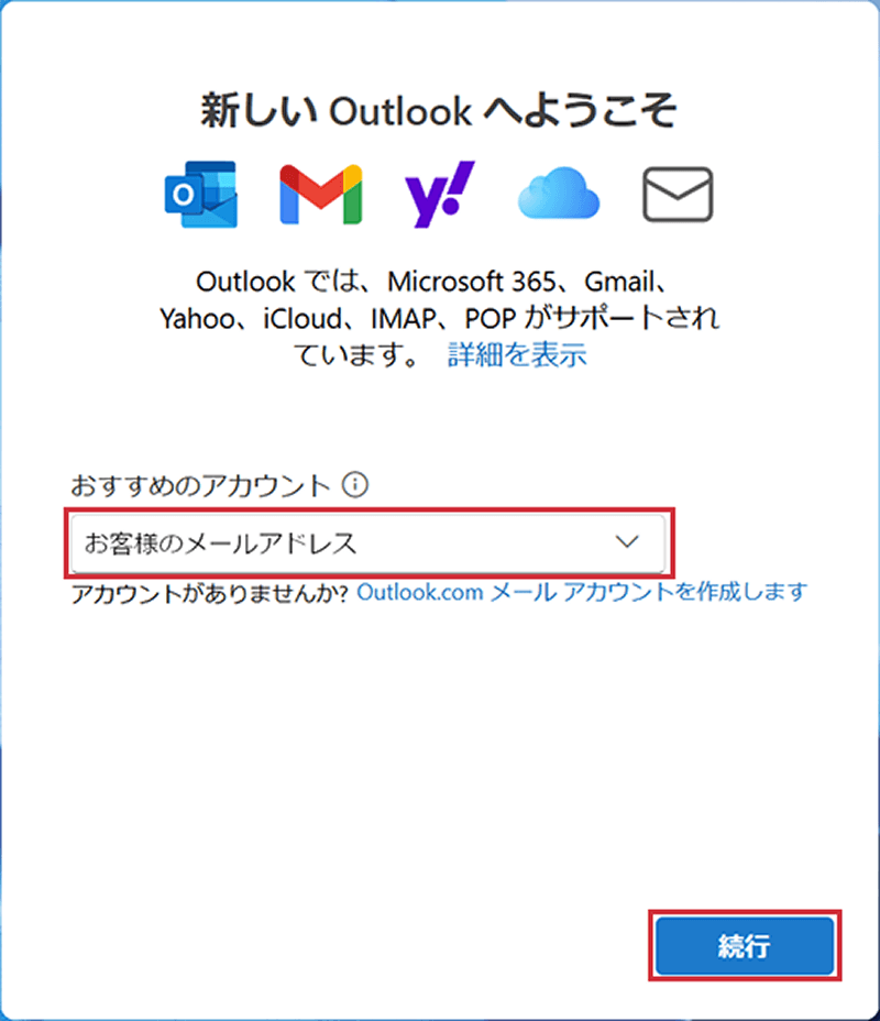 - 既存のメールアカウント設定がない場合、以下の画面が表示されます。画面の指示に従って設定を完了してください。