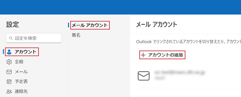 - 「アカウント」→「メールアカウント」を選択し、「アカウントの追加」をクリックします。