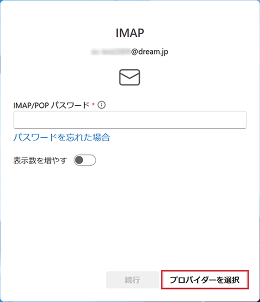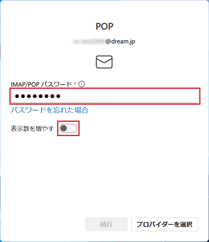 3 メールパスワードを入力し、表示数を増やすのトグルをクリックして「オン」にします。