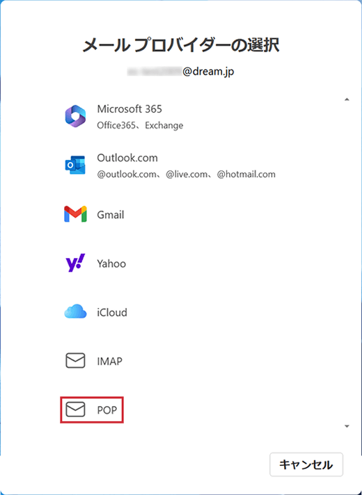 - 「プロバイダーを選択」→「POP」をクリックします。