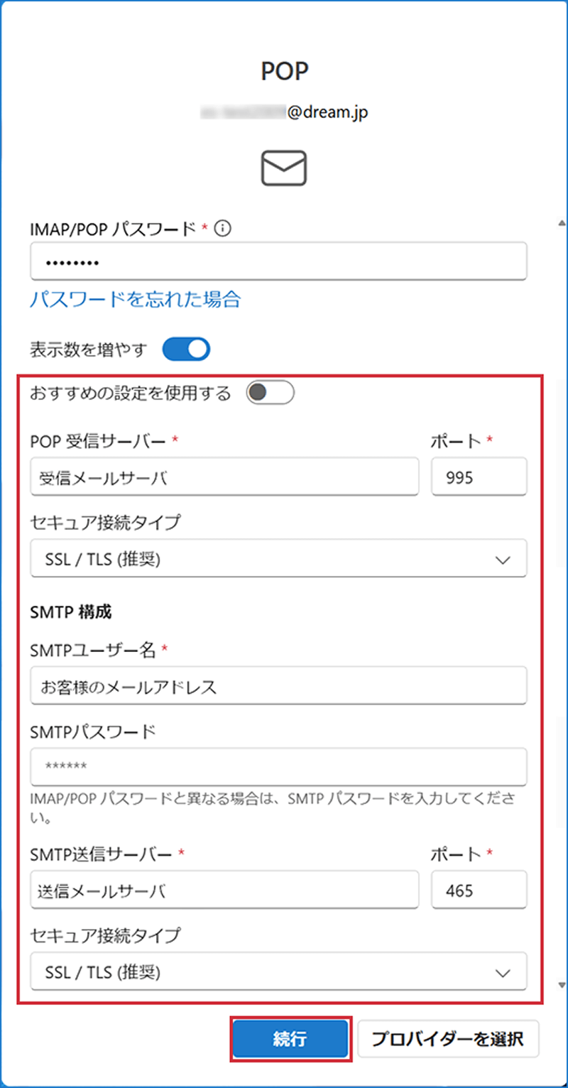 アカウント設定の入力内容表 おすすめの設定を使用する オフ POP受信サーバ 受信メールサーバ ポート 995 セキュア接続タイプ SSL/TLS(推奨) SMTPユーザー名 お客様のメールアドレス SMTPパスワード お客様のメールパスワード SMTP送信サーバ 送信メールサーバ ポート 465 セキュア接続タイプ SSL/TLS(推奨) メールサーバは下記をご参考のうえ、お客様のご利用に合わせて設定してください。